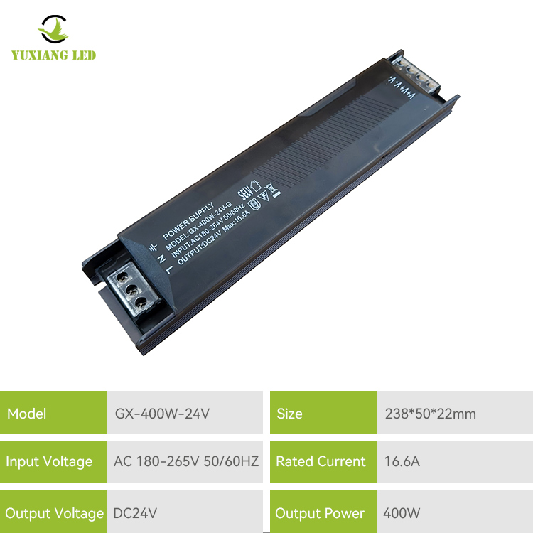 1 、 Guangzhou Yuxiang 24V400W Tensione costante Costage Semi-riempita di alimentazione a commutazione lineare, adotta guscio fotovoltaico di alta qualità, risparmio energetico e protezione ambientale, raffreddamento dell'aria naturale, basso rumore, installazione semplice, uso più sicuro e più affidabile.