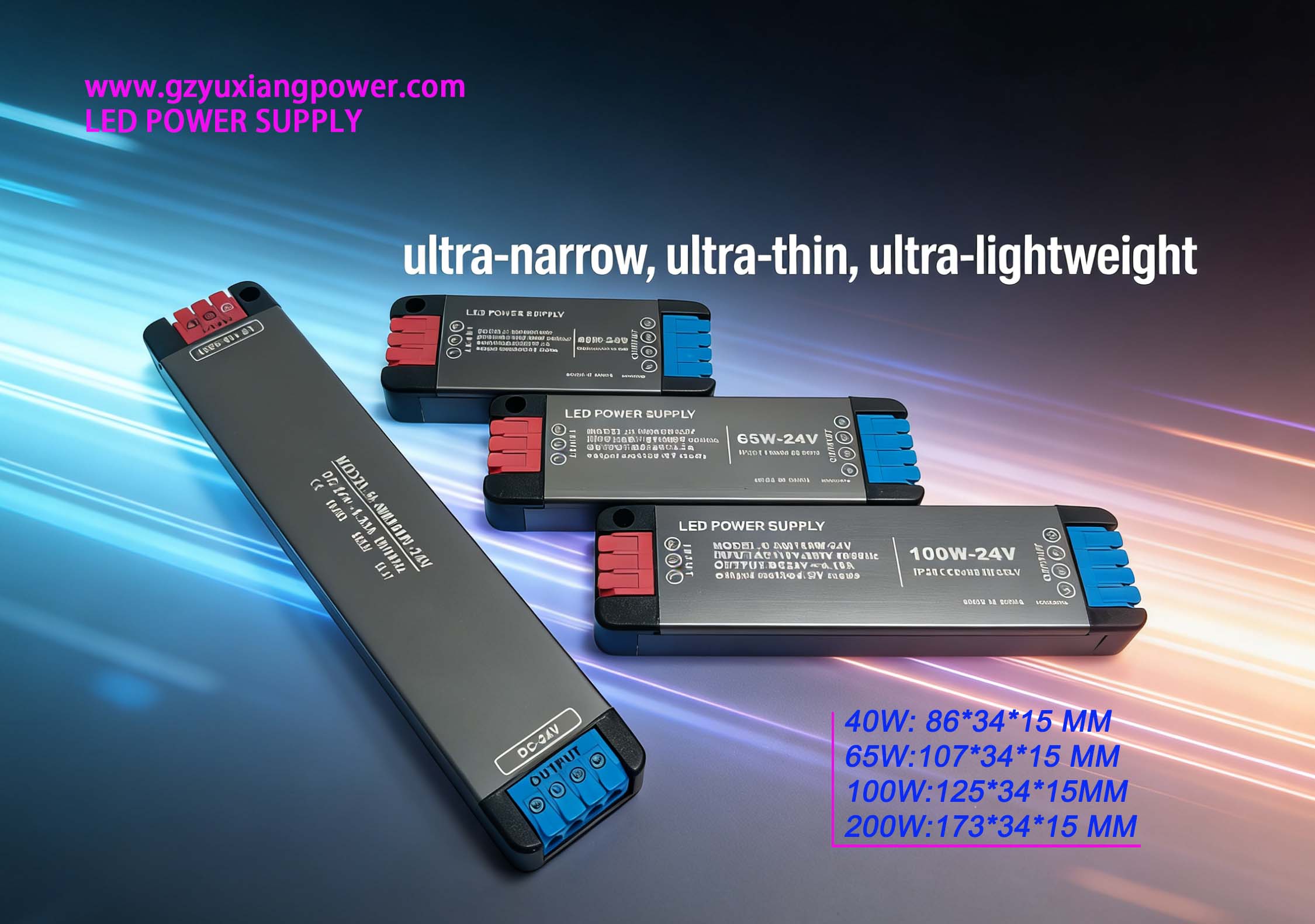 1、L'intera serie presenta un design ultrasottile e allungato, solo 15 mm di spessore e 34 mm di larghezza. Il modello più piccolo da 40 W è lungo solo 86 mm, mentre il modello più grande da 200 W è lungo solo 173 mm, davvero "abbastanza piccolo da stare nel palmo della tua mano!" Può essere facilmente incorporato in spazi ristretti come plafoniere, armadi, cantinette, scatole luminose e soffitti tesi, completamente nascosti senza ostruzioni, preservando l'estetica generale dell'arredamento. Pratico e poco ingombrante, risponde perfettamente alle esigenze di alimentazione nascosta dell'arredamento sia residenziale che commerciale.